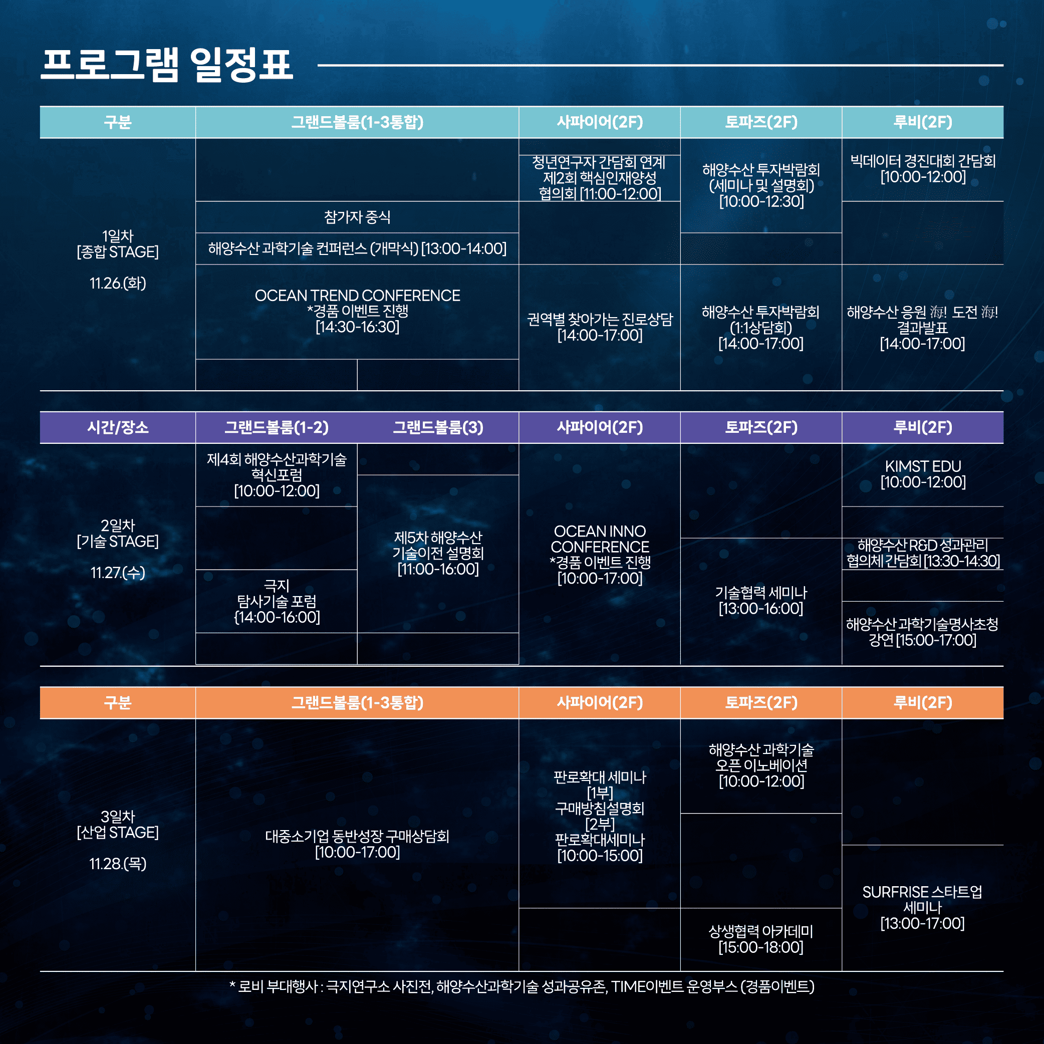 1일차엔 종합 STAGE, 2일차엔 기술교류 STAGE, 3일차는 산업 STAGE