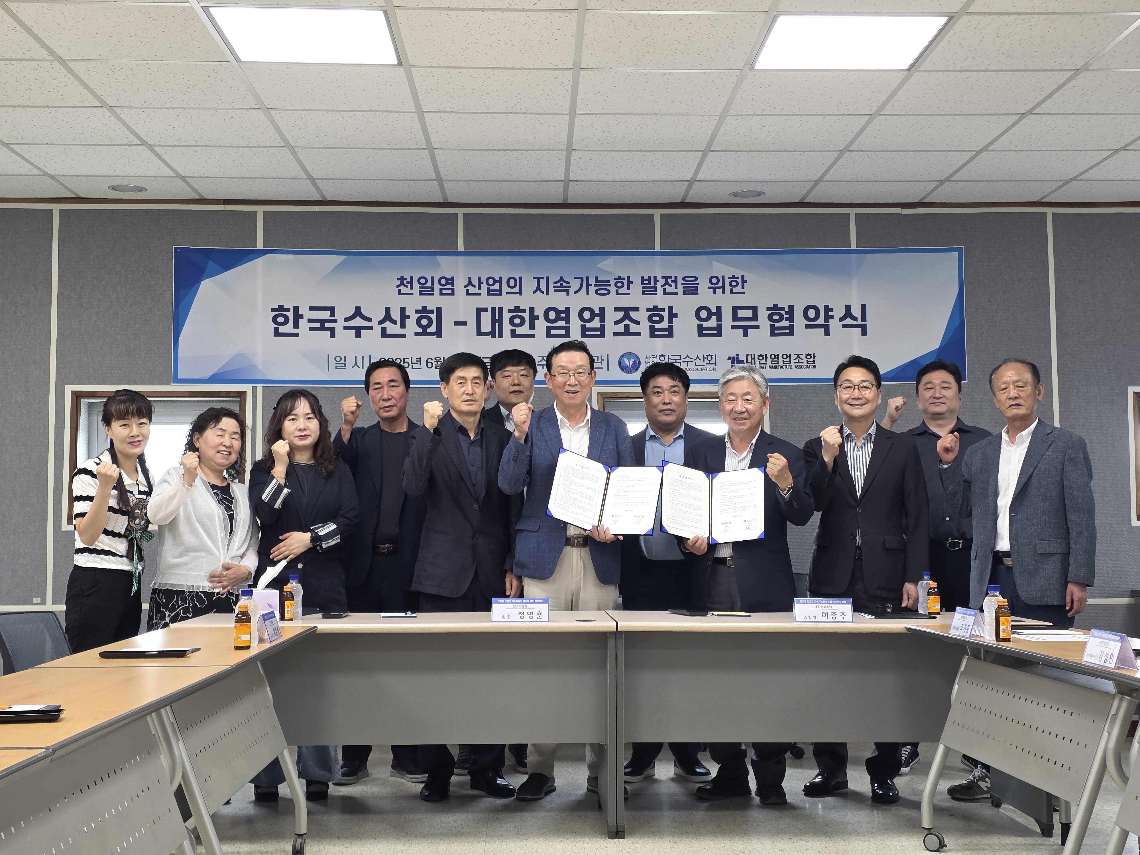 한국수산회는 6월 27일(금) 전남 목포에서 국내 유일의 전국단위 소금(천일염) 생산자 단체인 대한염업조합과 「천일염 산업의 지속가능한 발전을 위한 업무협약」을 체결했다.