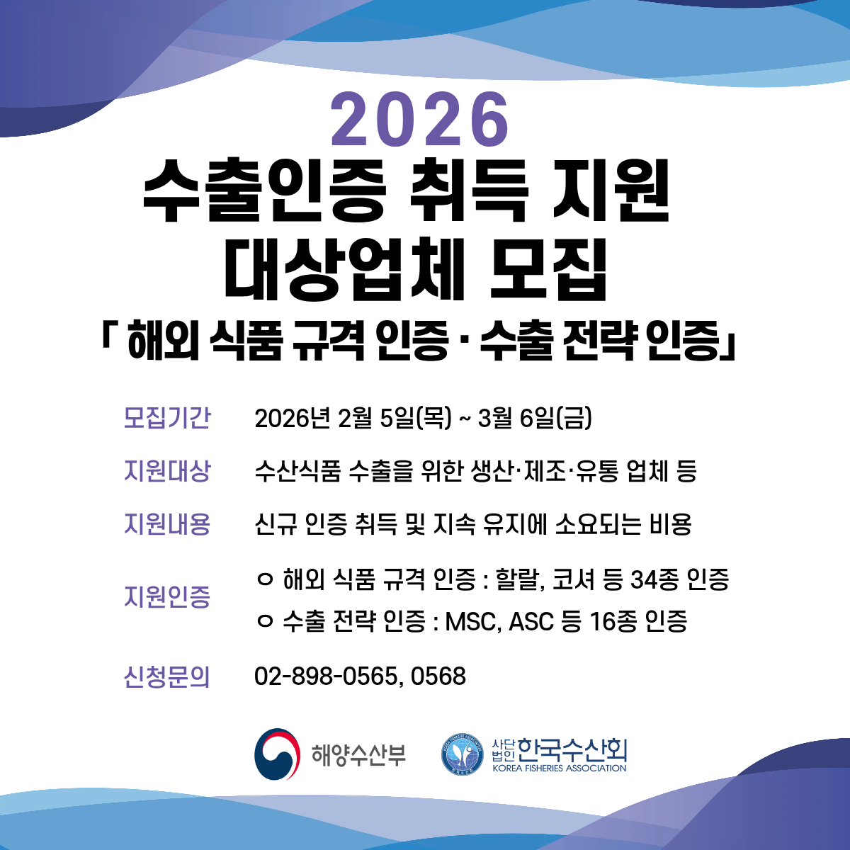 한국수산회(회장 정영훈)는 ‘2026년 해외시장 개척사업’의 일환으로 ▲해외 식품 규격 인증 지원 사업과 ▲수출 전략 인증 지원 사업에 참여할 기업을 2월 5일(목)부터 3월 6일(금)까지 모집한다고 밝혔다.이번 공고의 모집 대상은 ‘수산물, 수산가공식품을 수출하고자 하는 생산·제조·유통 업체’로 동일하며 사업 신청 방법 등 상세 정보는 ‘수산식품 수출지원 플랫폼(biz.k-seafoodtrade.kr)’에서 확인할 수 있다.